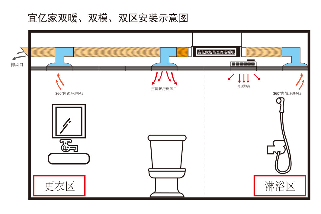 集成吊顶行业已经非常普及,电器的模块化根据实际的需要可随意安装于顶部的不同位置,受到广大客户的青睐!但是对于浴霸电器的取暖模式及安装位置大部分人就搞不清楚,使得真正运用时达不到理想效果!宜亿家智能电器研发团队深入了解浴室的结构形态,设身处地感受现阶段的产品体验,找出痛点,首家推出最合理浴室取暖方式:双暖、双模、双区360度全方位浴暖系统。